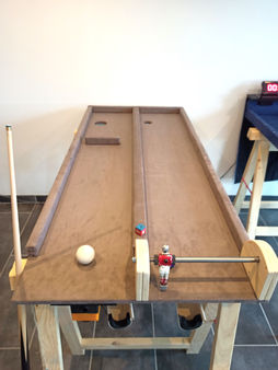 une table marron : parcours billard, parcours baby-foot